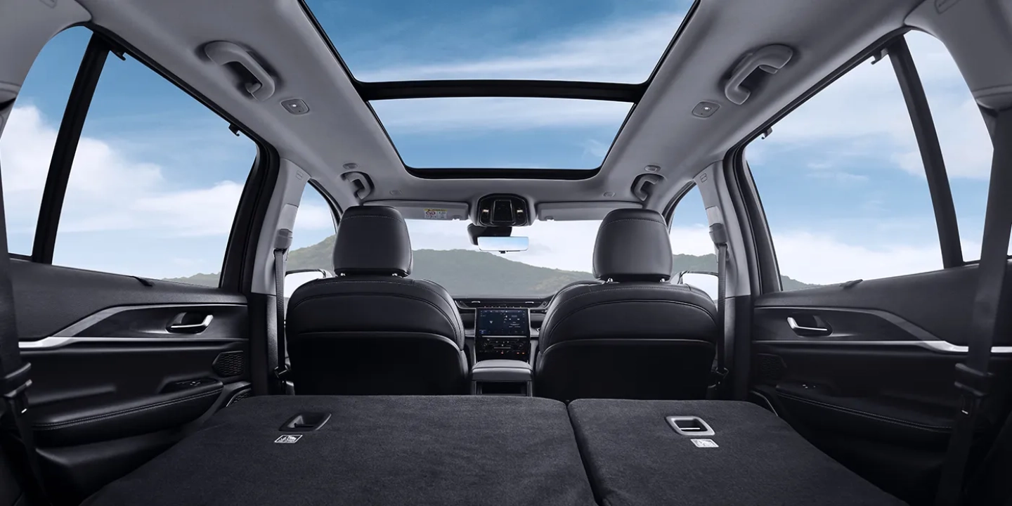 – Luxurious Interior: Premium leather upholstery, ventilated front seats, spacious third-row seating, dual-pane panoramic sunroof, and ambient lighting.